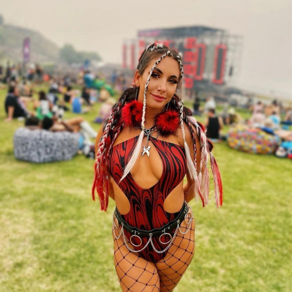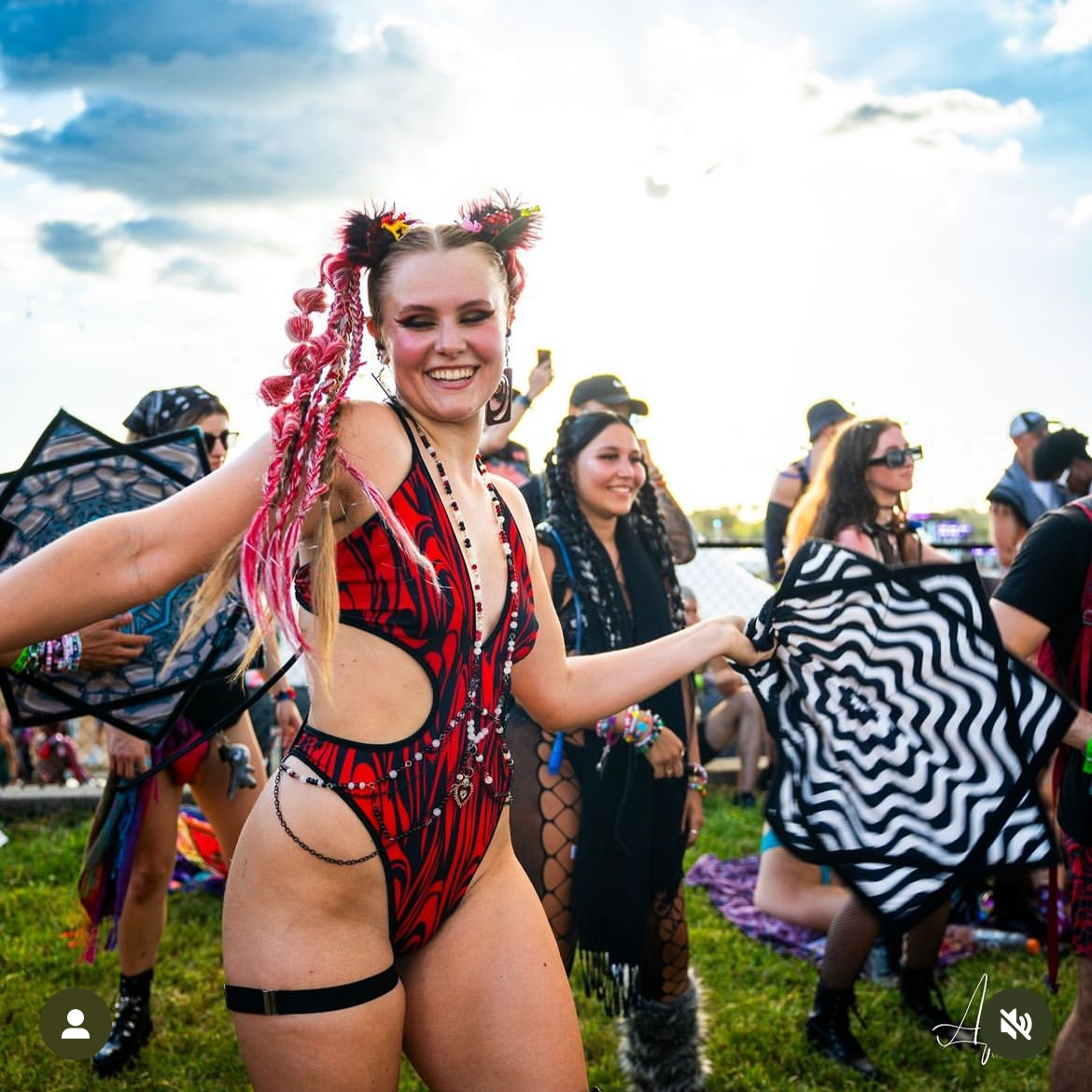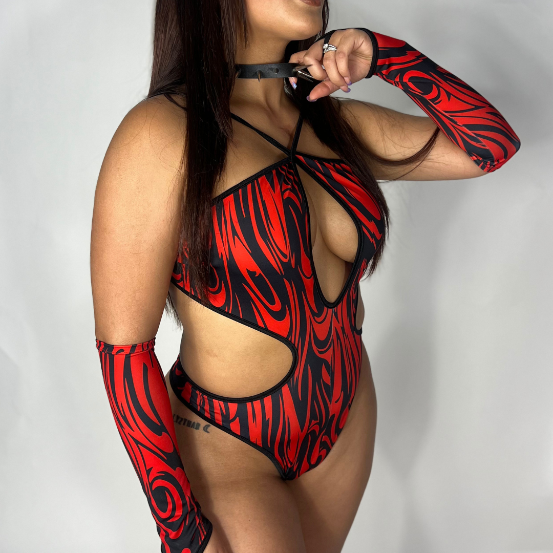 Featuring an adjustable back and thong-style design. Bold black and red fabric creates an edgy, festival-ready look, perfect for raves, nightlife, or photoshoots. Pair with matching bottoms, gloves, or festival accessories to complete your statement-making outfit.