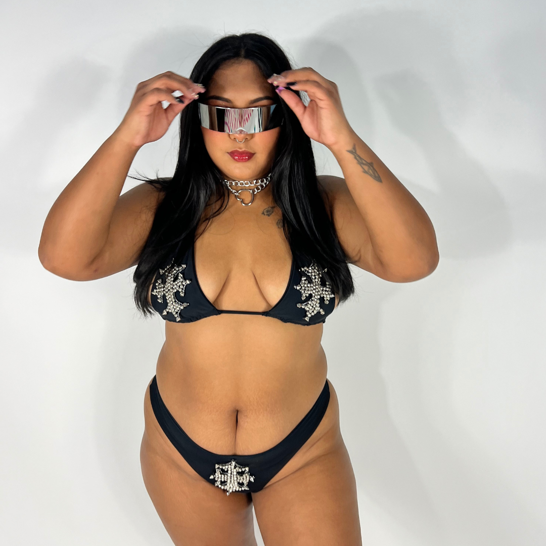 Make a bold statement with our Divinity High-Waisted Thong, featuring a striking silver cross applique and designed to perfectly match our Divinity triangle top. Sleek, high-rise, and festival-ready, this thong provides a flattering fit while keeping you comfortable for raves, festivals, or photoshoots. Pair with matching tops or layer with your favorite festival accessories for a complete, head-turning look.