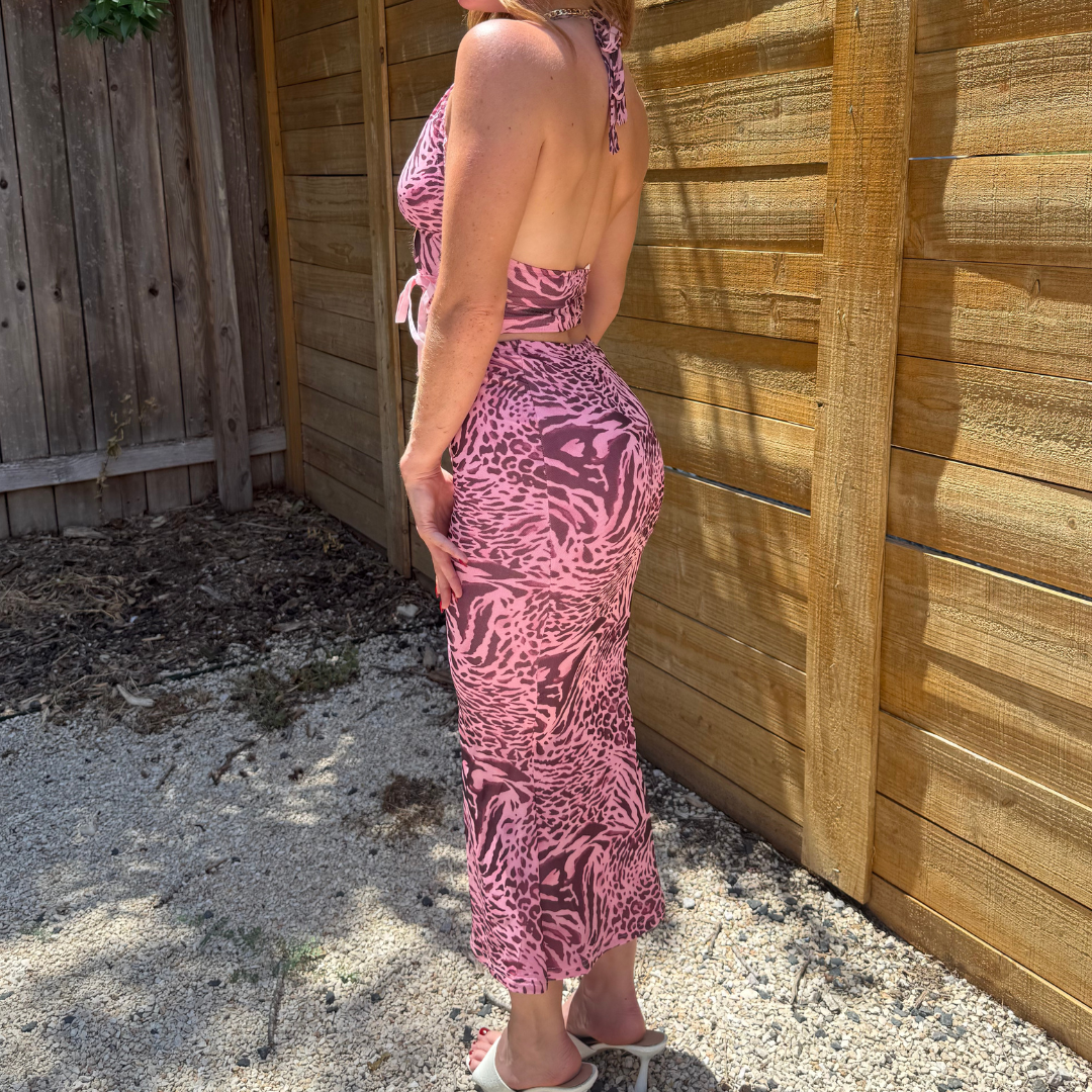 Unleash your wild side with the Pink Panthress Maxi Skirt Set, the perfect mix of jungle goddess energy and soft feminine lace. This two-piece set features a soft pink animal-inspired print that hugs in all the right places, paired with delicate lace trim and a flirty halter tie top.
