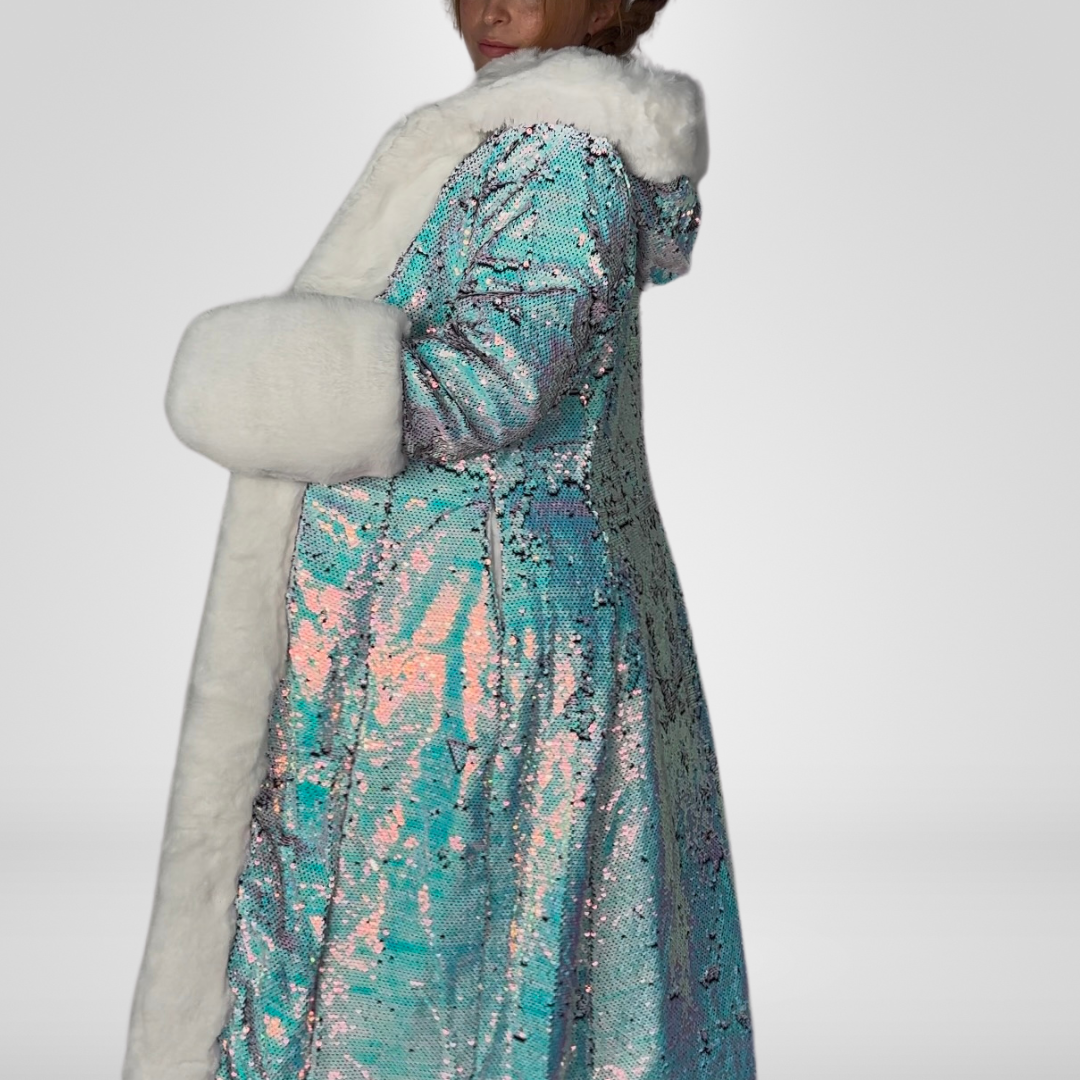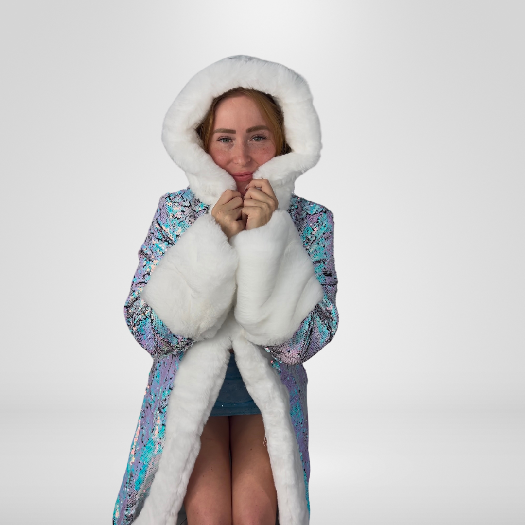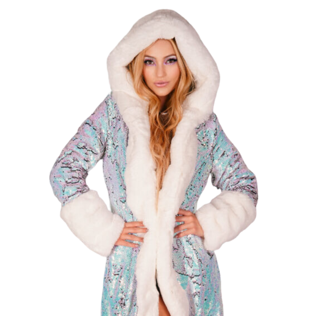 Stand out in the Arctic Luxe Coat – a floor-length blue sequin jacket with luxurious white faux fur trim and arm accents. This show-stopping piece combines dazzling sequins with cozy faux fur, making it perfect for raves, festivals, parties, or any event where you want to turn heads. Add glamour, warmth, and dramatic style to your outfit with this unforgettable statement coat.