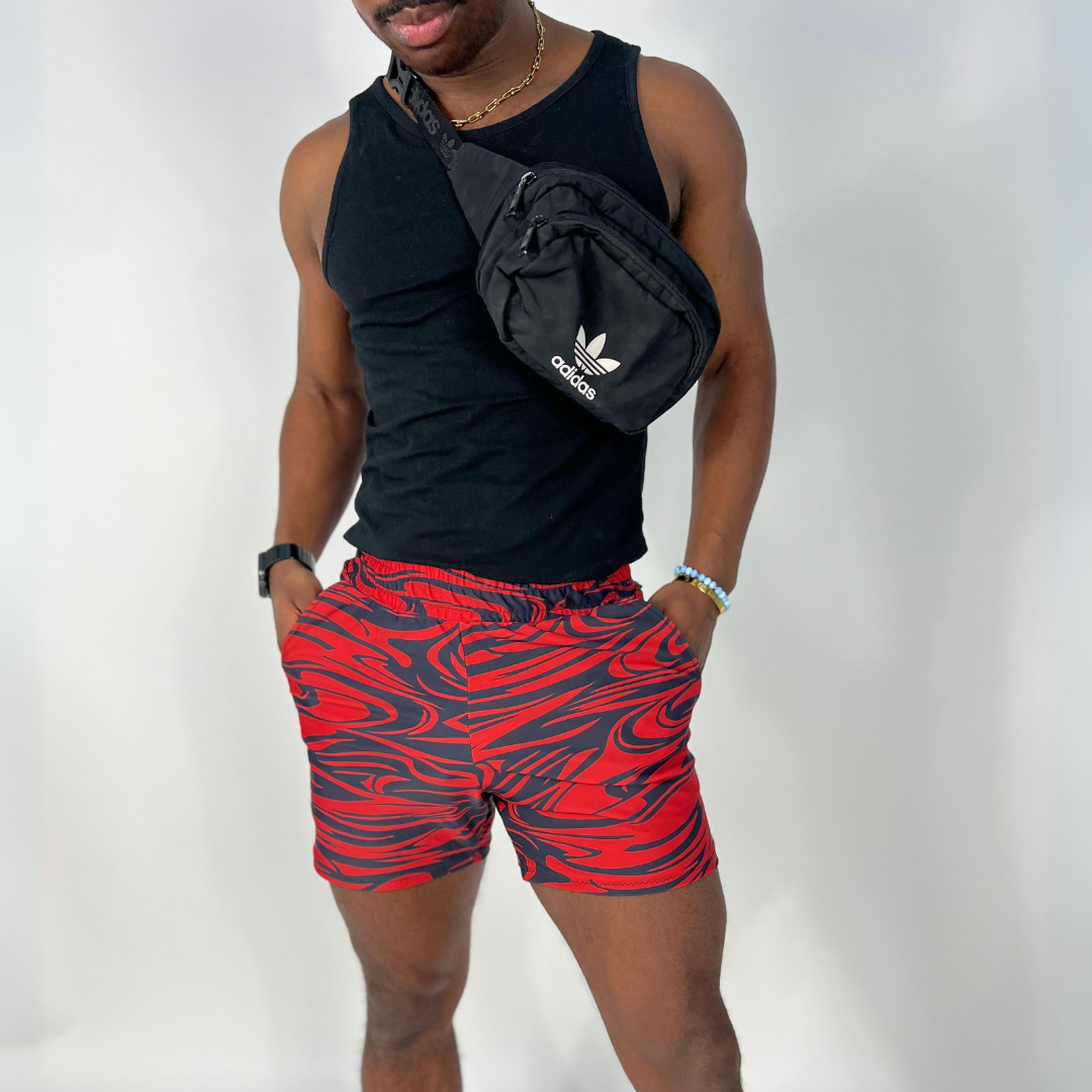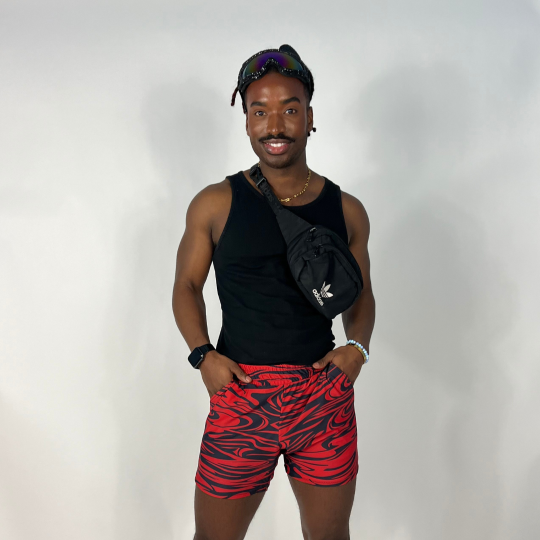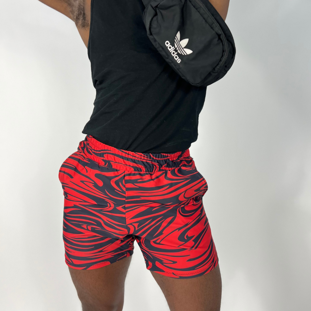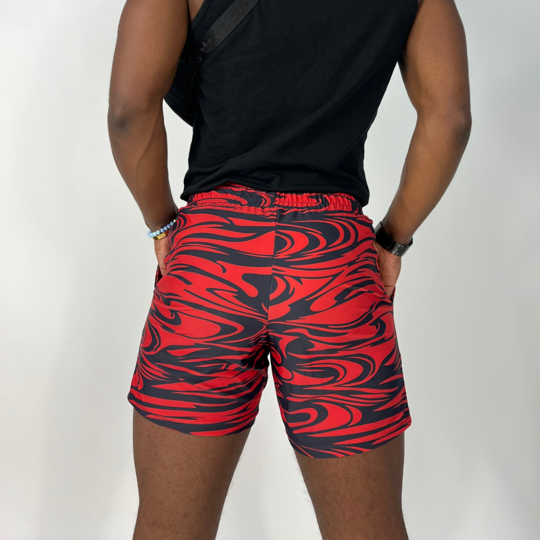 Light up the scene in Men’s 5-Inch Spandex Shorts with Pockets – Red & Black swirly pattern. Perfect for running, festivals, or daily wear. Stretchy, breathable, and pocket-friendly for all-day comfort.